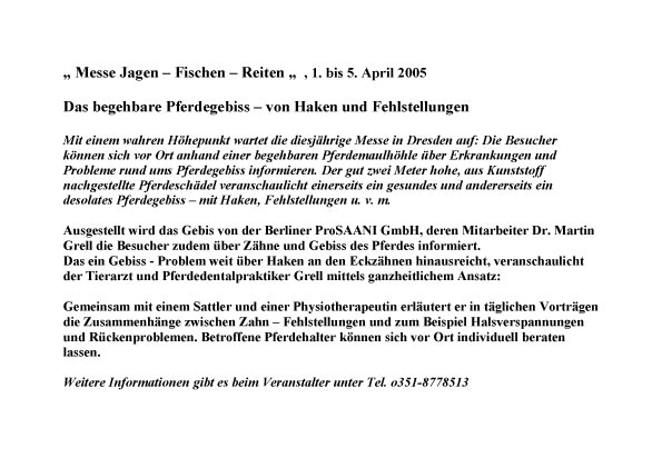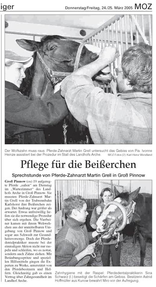 Der praktische und FEI-Tierarzt Martin Grell ist nicht nur als tätiger Veterinär, sondern vor allem als Pferde-Dental-Praktiker weit über regionale Grenzen hinaus bekannt und reist für Zahnbehandlungen an Pferden quer durch die gesamte Bundesrepublik. [...]